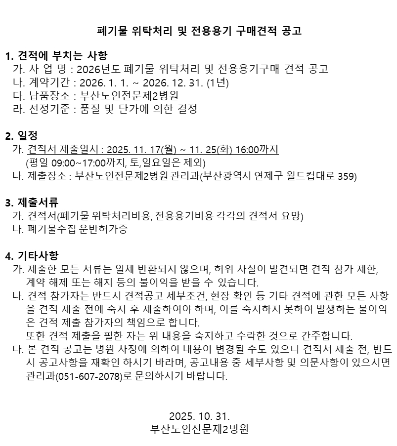 2026년도 폐기물 위탁처리 및 전용용기구매 공고